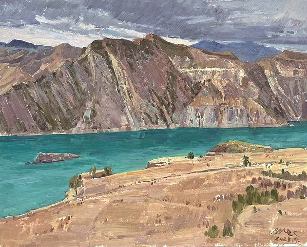 2025年秋,我随辽宁画院举办的“文化润疆”写生采风活动来到位于新疆昌吉回族自治州的肯斯瓦特水库。第一次来新疆写生的我,被西部辽阔而壮美的大山大水所震撼,也为新疆生产建设兵团当年感天动地的奉献与付出所触动。作为新疆生产建设兵团首个独立建造的水利工程,肯斯瓦特水库具备防洪、灌溉、发电等综合功能,有效解决了玛纳斯河的洪涝问题并保障了该流域的经济发展。我站在水库边远远眺望,水面因矿物成分与光照影响呈现出蓝绿色,尽显妩媚。对岸的红色丹霞山体雄浑壮阔,与涌动的厚重云层形成静与动的对比。面对这一自然与人类共同创造的美景,我支起画架,撑起画布,一画便是一整天。这幅《高山平湖·肯斯瓦特水库》也成为那次写生旅程的珍贵纪念。