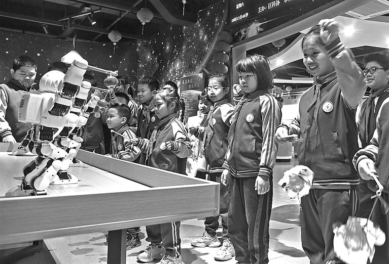 2月28日,福建省泉州市泉港科技馆联合后龙镇关工委、后龙实验小学开展“智趣元宵 点亮童心”元宵节主题活动,邀请辖区35名留守儿童走进科技馆,欢度元宵佳节。图为孩子们在与机器人互动。