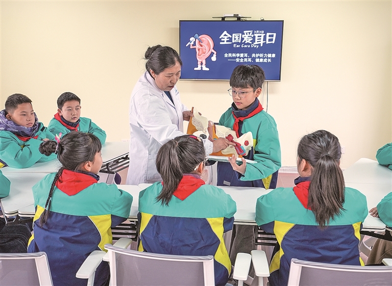 3月3日全国爱耳日来临之际,各地开展形式多样的主题活动,宣传爱耳护耳知识,关爱听力健康。图为3月2日,在江苏省泰州市姜堰区天目山街道,医护人员给泰州市姜堰区康华小学学生讲解耳朵构造及科学护耳知识。