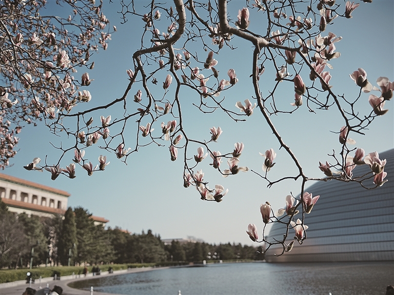 3月3日,北京长安街边,国家大剧院旁的玉兰花竞相绽放,春意盎然。