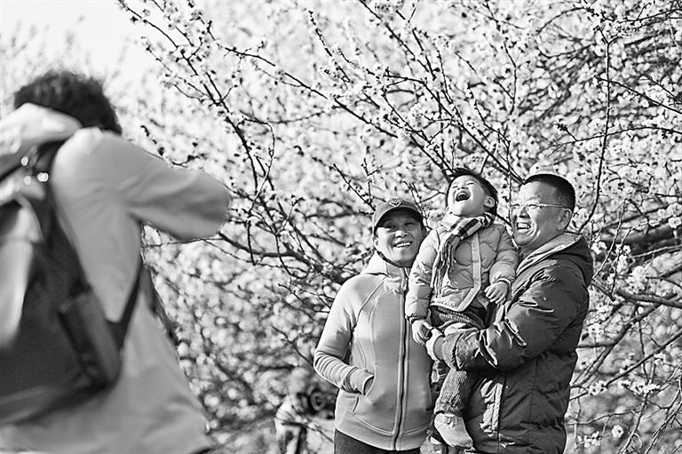 近日,位于陕西省的西安大明宫国家遗址公园内繁花盛开,吸引游人前来踏青赏花,感受美好春光。图为3月9日,游人在赏花留影。
