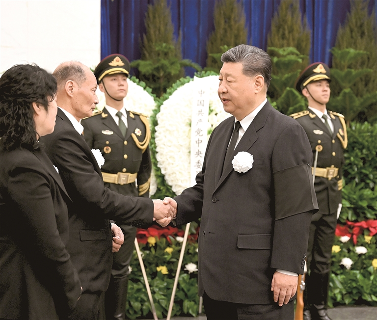 上午9时30分许,习近平、李强、赵乐际、王沪宁、蔡奇、丁薛祥、李希、韩正等,在哀乐声中缓步来到宋平同志的遗体前肃立默哀,向宋平同志的遗体三鞠躬,并与宋平同志亲属一一握手,表示慰问。胡锦涛送花圈,对宋平同志逝世表示哀悼。