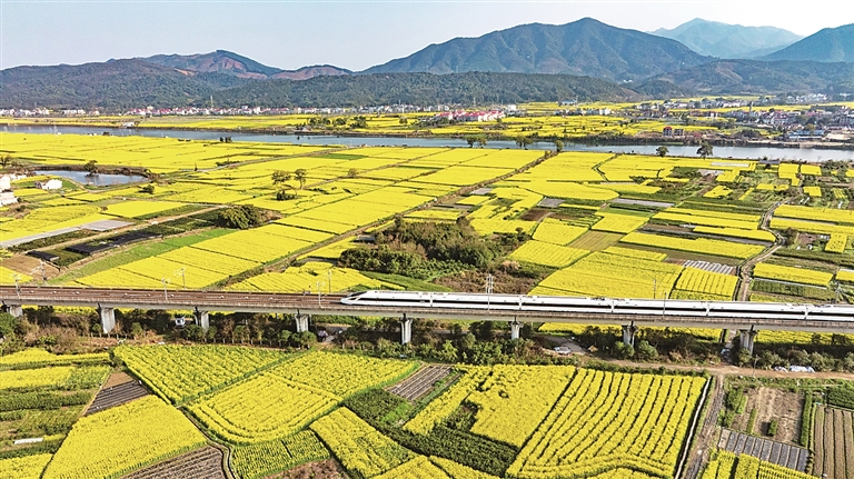 近日,江西宜春袁州区彬江镇彬江村的油菜花竞相绽放,金黄色的花海与山峦、村落、河流交相辉映,构成一幅春日田园画卷。