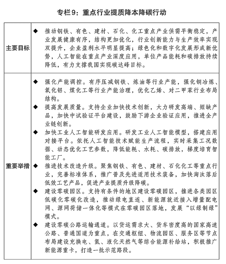 一是积极稳妥推进碳达峰。全面实施碳排放双控制度,制定实施碳达峰碳中和综合评价考核办法和更高水平更高质量做好节能降碳工作的意见,扎实开展“十五五”碳达峰行动,建立可再生能源消费最低比重目标制度。坚决遏制高耗能高排放项目盲目发展,严格实施固定资产投资项目节能审查和碳排放评价,对新上高耗能高排放工业项目实施碳排放等量或减量置换。深入推进重点行业节能降碳改造,依法依规淘汰落后产能。制定能源强国建设规划纲要,加快新型能源体系建设,有序推进“沙戈荒”新能源、西南“水风光”清洁能源和采煤沉陷区新能源基地建设,加快推进跨省清洁能源输电通道规划建设,因地制宜发展分布式能源,积极发展抽水蓄能、新型储能,加快智能电网建设。推动煤炭消费清洁替代,开展煤电和煤化工低碳化改造,推动现代煤化工与绿氢、生物质等新能源耦合发展,加快淘汰落后燃煤设施设备。推进零碳园区和零碳工厂建设,推进氢能综合应用,启动零碳公路运输通道示范路段建设。制修订一批能耗强制性标准和碳排放管理相关标准,强化行业、企业、项目、产品碳排放管理支撑。完善碳排放统计核算、碳足迹管理体系,建立绿色贸易进出口统计制度和监测体系。进一步扩大碳排放权交易市场覆盖范围,完善全国温室气体自愿减排交易市场制度体系。
