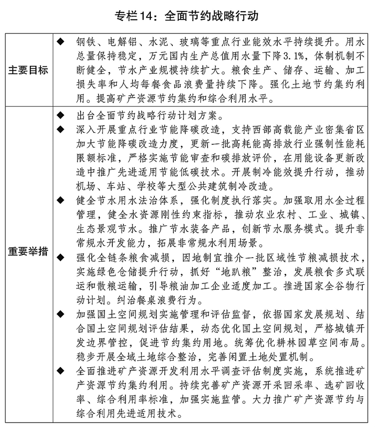 三是全面节约战略实施成效明显。统筹推进“能水粮地矿材”一体化节约。有力有效管控高耗能高排放项目,深入实施重点领域节能降碳专项行动,加快存量项目改造升级和依规淘汰,制修订24项能效能耗强制性国家标准,扣除原料用能和非化石能源消费量后的单位国内生产总值能耗降低5.1%。建立健全农业节水增效、工业节水减排、城镇节水降损制度体系,加强再生水等非常规水利用,万元国内生产总值用水量下降4%左右。深入开展粮食节约和反食品浪费行动,强化全链条粮食减损和餐饮行业反浪费。大力发展循环经济,加快构建废弃物循环利用体系,提高资源综合利用水平,废钢铁、废有色金属等10种主要再生资源回收量超过4亿吨,大宗固体废物综合利用率超60%,主要资源产出率进一步提高。