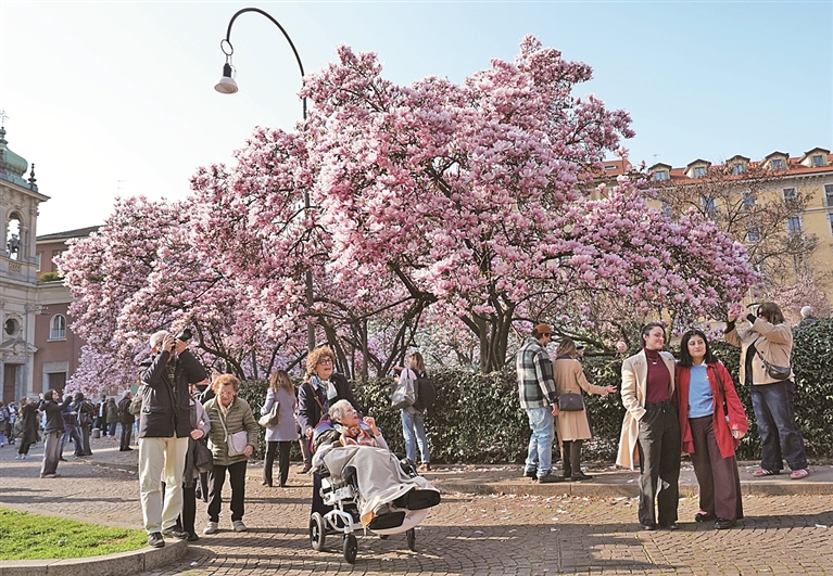 眼下正值意大利米兰玉兰花花期,人们趁着晴好天气出门踏青,赏花休闲。图为3月13日,市民在意大利米兰赏玉兰花。新华社发