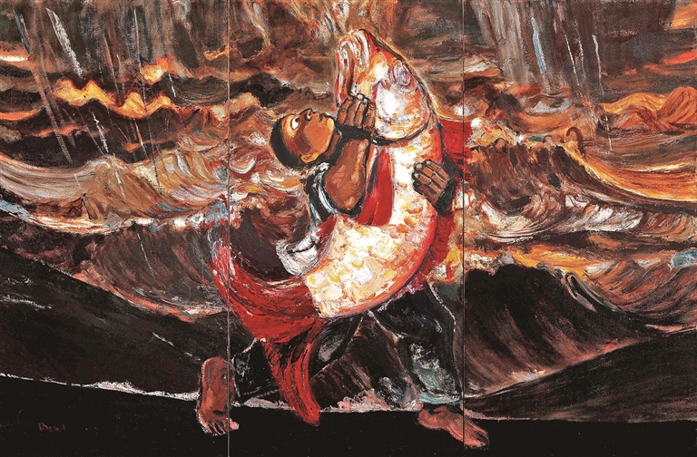 段正渠的创作深受陕北文化的滋养,其后期画风转向表现风格,画面充满黑色粗粝的线条、厚重的笔触,以及夸张而充满神秘性的人物与风景造型。画中的点、线、面并非纯粹的抽象形式,而是深深植根于陕北那片黄土地的“血肉”与“魂魄”之中,如《黄河传说》《夜行》《油泼面》《北方之一》《玩火少年》等,融合了民间信仰、地方风情与东西方表现主义传统。他常用大刷子、刮刀等工具,将浓郁黏稠的颜料以近乎砌墙的方式堆砌在画布上。色块往往不是平滑过渡,而是形成斑驳的、犹如土地龟裂般的表面。底色常以深褐、赭石、群青为主,营造出黑夜、窑洞或黄土高原的基调。亮部的黄色、红色、白色则异常醒目,如同黑暗中迸发的生命之火。运用带有金石味、顿挫感的轮廓线,赋予人物雕塑般的稳定和力量感。同时他汲取民间艺术的“魂魄”,画面美学与陕北汉画像石、民间剪纸、炕围画的造型语言一脉相承。