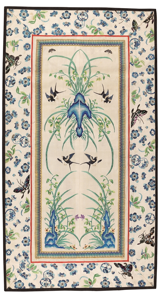 这件绣品的左右单件挽袖,均为对角式构图,下方和中心偏上方有两块湖石,周围是盛放的兰花,叶片修长,花茎劲挺,花姿婉约,参差错落,疏密有致。春燕与蝴蝶似被幽幽的兰香所吸引,穿梭于花丛之中,大有“兰芳人未采,花发蝶先知”之意。