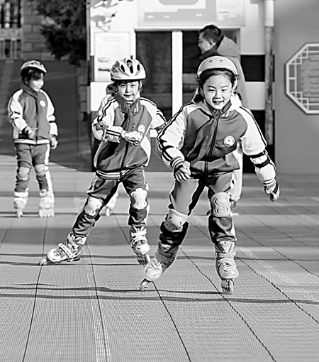 “首先得学会保护自己,不怕跌倒,才能勇敢地向前滑行。”校长曾品祥介绍,学校利用体育课为一年级全部学生普及冰雪运动课程——春季学期学轮滑,秋季学期上冰面,每周按时开展。
