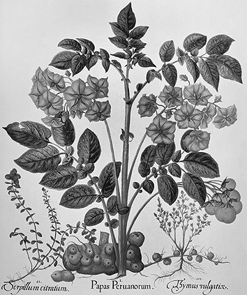 早在十六世纪中叶,西班牙人已在美洲食用土豆。编年史家胡安·德·卡斯特利亚诺斯称其为“埋在地下的圆根,或白或紫或黄,粉质可食,是印第安人的食物,也受到西班牙人的欢迎”。“生长于地下”在当时隐含某种道德嫌疑,似乎与泥土的亲密昭示着种植和食用者的低微。十六世纪后,土豆成为某些欧洲贫民的食物,也被用于喂猪。“印第安人的食物”这一标签,让它在跨越大西洋之后仍旧带着殖民地的印记。