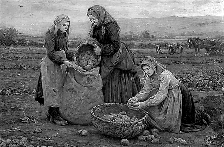 然而,盛誉之下,另一种变化也在悄然发生。来自安第斯山区丰富的土豆被筛选、培育,强调高产与可复制性。土豆的传播不再依赖社区交换,而是通过行政命令和统一规划,土豆逐渐成为可以单一种植的大规模作物。十九世纪初,疑虑开始浮现。马尔萨斯担忧高产而廉价的食物会刺激人口过度增长,加剧贫困和资源紧张。土豆在部分舆论中被贴上“邪恶之根”的标签,成为人口与贫困问题的替罪羊。它既被视为繁荣的引擎,也被指为失序的诱因,这点在爱尔兰体现尤为极端。