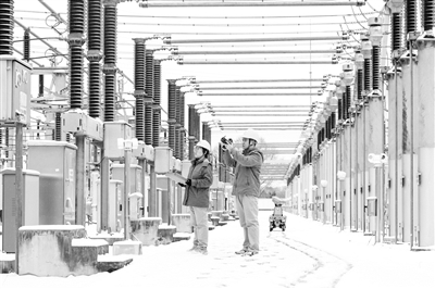 近期,针对大范围降雪及降温天气,各地采取多项措施积极应对。图为国网泰州供电公司运维人员使用机器人等设备对变电站进行雪后巡视。