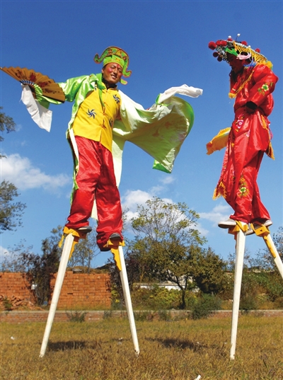 男扮女装所登的高跷有所不同,每支高跷有两个登腿,上边登腿人的腿脚被服装遮挡,下边登腿露出两只特别制作的女人缠足小脚,使表演更富有戏剧性,增强了表演的艺术效果。