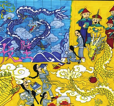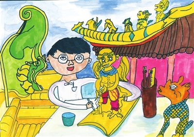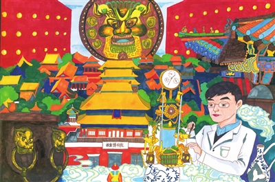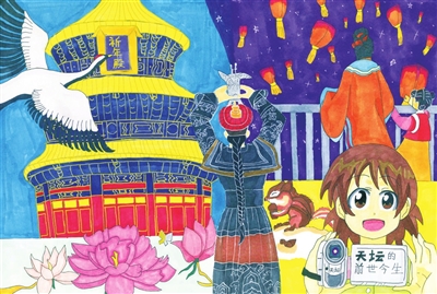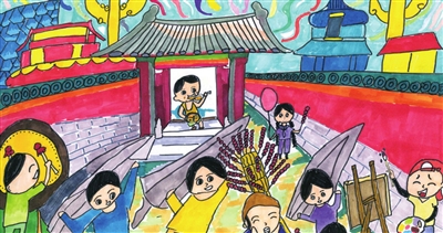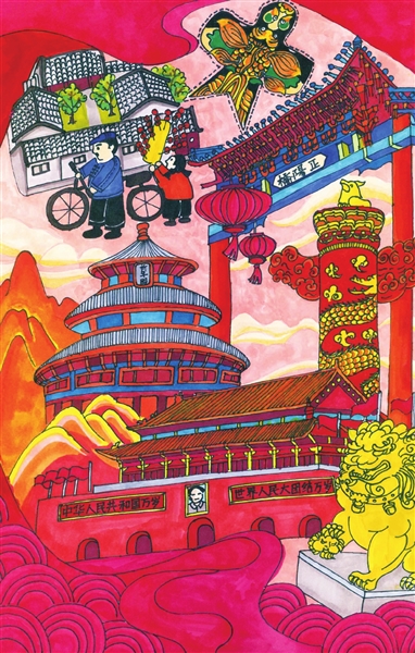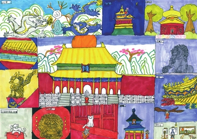 吹糖人 王星涵 11岁 天坛的前世今生 李筱雨 13岁 九龙壁的故事 崔文睿 10岁 红色骄傲 蔡维育 15岁 最美中轴线 门苗 10岁 中轴线上的大栅栏 王馨瑶 8岁 中轴线守护人 廖聆画 8岁 新一代华夏文明的传承者 彭嘉悦 11岁 梦回故宫 尹可昕 10岁 中轴线上画北京 毕芮嘉 5岁 故宫记忆 冯颖心 11岁 编者按:为助力北京中轴线遗产保护,丰台区少年宫动·空间学生在这个暑期用画笔描绘多彩中轴线,向世界宣传中轴线文化。在文化底蕴深厚的丰台,动·空间学生拿起画笔,从不同角度画中轴线的故事,多维度感受中轴线魅力,用卡通人物讲故事的形式讲述中轴线上的历史与文化,用画笔记录北京中轴线风貌就像在学生心中埋下了种子,对于土生土长的丰台学生来说,中轴线不仅是地理位置,而且是根植于血液中的成长记忆。 ■ 辅导老师:冯胜男
