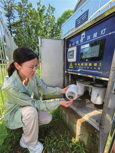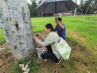 “你看,这是蝽,这是虫卵,白皮松上面的蝽我要带回去研究,看看对树有无危害,虫卵我要带回去养几天,看看是啥虫、有没有天敌昆虫寄生。”赵京芬说着从包里拿出塑料袋,将几只蝽和不知名的虫卵装进去。聊到虫子,她打开了话匣子,向记者介绍,有常见多发且扰民的国槐尺蠖、草履蚧、蚜虫等,有危害严重的“外来物种”美国白蛾、红脂大小蠹……自然界中还存在着许多有害生物的天敌昆虫,如赤眼蜂、瓢虫、小花蝽……