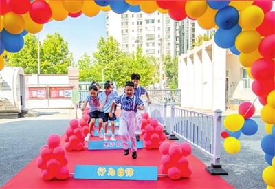 北京怡海小学校长、老师们在校门口迎接二至六年级即将返校的同学们。为了迎接校园的“小主人”,学校提前为新学期的到来做好了精心的准备,教室里整洁的桌椅、崭新的教科书、温馨的读书角、用心设计的墙面,无不流露出对学生学习成长的呵护与期待。