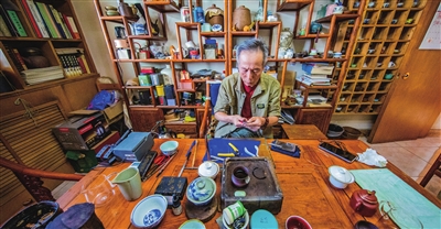 他把锔瓷和篆刻的手艺与国学艺术相结合,一只青花龙凤纹压手杯的杯口磨损了,他不仅包了整齐的银边,还在银坯上雕了细细的卷云纹。修缮的器物也不再局限于瓷器,千奇百怪什么都有,小到一枚玉扳指,大到一张木条案,都在他的修缮后重获新生,有时物件太大无法搬到工作室,他就提前准备好物品上门去修,甚至还曾有朋友邀请他去故宫修扇子。“现在的锔瓷更多的是秀活,人们更加追求瓷器的美感和艺术性,所以光有锔瓷的技术是不够的,以刻瓷为例,既要有锔活的基础,还要有古纹饰的常识,还要有绘画的常识,不一定精通,但是一定要懂一点,这样在修古玩的时候才能选到合适的式样和材质,修好之后让人觉得相得益彰,甚至更有艺术价值。”刘老师说,篆刻、锔瓷、书画、玉石都属于国学的范畴,可以触类旁通,有锔瓷的底子,会想到很多办法,比如修扳指,他用的就是修茶壶的内包口的办法,从里边向外修,在扳指内侧打个银环,给它撑起来,就不会影响外侧的美感。“一旦撞进来,天地很宽。”说起瓷和陶的不同烧成温度,他张口即来,谈到雕刻印章的各种石材他熟稔于心,提及玉石翡翠的不同特点他更是门儿清。“接触的多了,眼光手感就都练出来了,材质我不会认错,新老可是说不准。”他诚恳地说。
