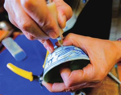 “一开始是以粗活为主,锔好了能用就行。而且那会儿东西少,修补一件比买新的便宜多了,所以修锅碗瓢盆的都有。现在不一样了,物质丰富了,锔瓷也以秀活为主,讲究的是精细、美观和艺术性,有时修一件瓷器的价格比买一件新的都贵,但还是会有人来修,有的是因为用得年头儿长了即使坏了也舍不得扔,有的是瓷器承载了一些特别的记忆,还有更多的是玉器、古玩等收藏品。”刘老师告诉记者。