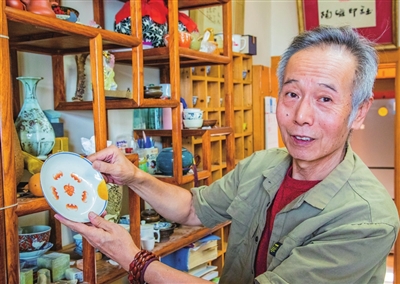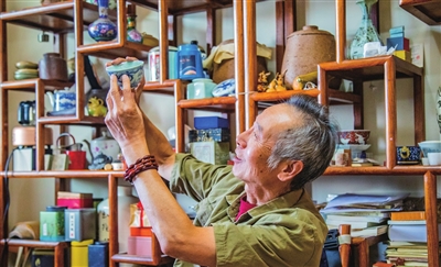家住丰台区程庄路的刘老师有一间自己的国学工作室,名为顽石堂,工作室内还挂有启功先生亲笔题的“顽石堂”牌匾,记者之所以将之称为国学工作室,是因为在这里不仅可以欣赏学习到锔瓷技艺,还可以学习篆刻、书画,而且刘老师还是中国收藏家协会的会员,对硬片儿(瓷器)、软片儿(字画)和杂项(玉器、骨头等)都很有研究,尤以锔瓷、篆刻为人称道。