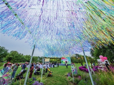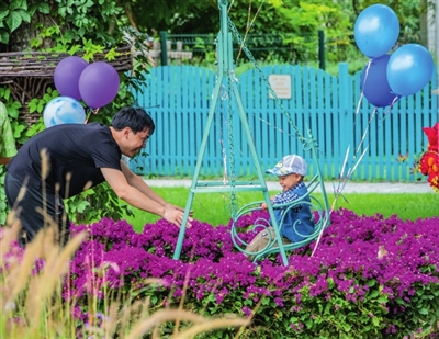 “妈妈,你看这里有个紫色的迷宫,还有挂着气球的秋千。”绿色的大草坪上,小朋友或是坐在红色“砖房子”旁边的南瓜凳子上,或是欢快地穿梭在五光十色的风车和气球间,或是在紫色的三角梅迷宫中跑跑跳跳,还能在挂着彩色气球的浅绿色秋千上玩一会儿。