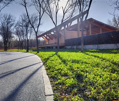 B地块绿化面积达到19.8万平方米,共栽植了乔木7000多棵、灌木20万株、地被栽植20万平方米,还种植了白蜡、楸树、元宝枫、银杏、榆叶梅、海棠等植物,山坡上是成片的黄栌和山桃,形成四季景色差异。为了保护生物多样性,还增加了桑树等食源性植物的比重,并在水系中建设不架桥的“无人岛”,形成天然的湿地生态。