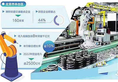 “产业链条全、创新引领强、国有民营错位发展,是我们轨道交通产业发展的三大特点。”丰台科技园区管委会副主任魏欣亚告诉记者,丰台园企业覆盖轨道交通规划设计、工程建设、装备研制和运维管理全环节,有轨道交通重点企业160余家,收入规模连续八年突破千亿元,年均复合增长率超10%,2022年营业收入超2500亿元。这些企业中,民营企业占44%,其中不乏专精特新“小巨人”企业。