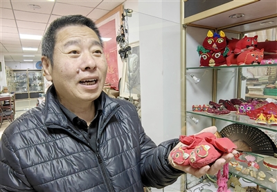 在陈列展室专门有一个展示虎头鞋的展柜,形形色色的虎头鞋样式新颖、色彩鲜艳,有的显得陈旧,有的崭新如初。“这双红色的虎头鞋是长辛店居民捐赠,也是陈列展室的第一件藏品。”尹喜军拿起虎头鞋向记者展示。虎头鞋做工复杂,既有实用价值,也有观赏价值,同时它又是一种吉祥物。