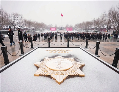 10时,雪花翩然飘落,参加悼念活动的人员秉花肃立,为死难者同胞沉痛默哀。随后,铿锵的演讲声响彻抗战馆馆前广场,“在这场不堪回首的噩梦中,数不胜数的黎民百姓惨遭迫害……先辈为正义的呐喊犹在耳畔……”高校师生代表立下誓言:“如今,中华儿女更应时刻铭记那段历史,将每一次对历史的反思化作再次出发的动力,为实现中华民族伟大复兴事业不断奋斗!”随后,全体人员拾级而上,缓步来到纪念馆序厅,将手中菊花敬献在大型浮雕“铜墙铁壁”前,向抗战英烈鞠躬致敬。