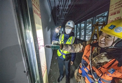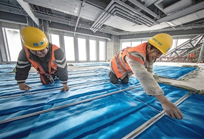 记者站在施工平台向上看,国金大厦的玻璃幕墙仿佛巨型幕布,将蓝天白云与周围丽泽SOHO等建筑群映射其中。项目负责人介绍:“玻璃幕墙单块玻璃的面积就超2.5平方米,为更好处理玻璃面积大的难题,我们采用SGP玻璃胶片,它能够改善夹层玻璃的刚度和残余强度,提高采光顶玻璃的使用安全性能。同时,通过在玻璃三角形边部增加防脱落型材构造措施,也进一步增强了斜面玻璃的可靠性,避免了高空作业人员的人身安全、物体掉落等危险以及交叉作业风险,为地面操作的精准焊接提供了保障。”