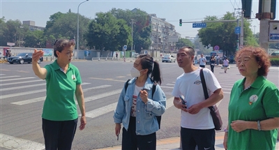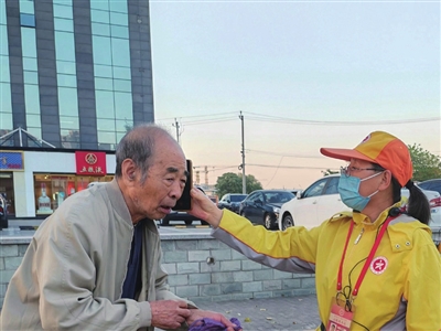 卢沟桥街道文明引导员在执勤时遇到一位忘带手机的老人,便用自己的手机帮助老人拨通其家人电话,帮助老人与家人取得联系。