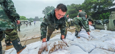 “八一”当天,丰台区各单位、各部门依旧奋战在防汛抢险救灾一线,守护居民安全。丰台驻区部队来到卢沟桥防汛抢险救灾现场,官兵们协力抗洪,扛起一摞摞沙袋,为百姓筑起“安全线”,度过了一个难忘的建军节。