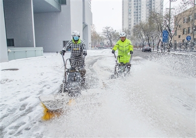 12月北京持续降雪。为了保证雪后车辆、行人的出行安全,全区各相关部门、街镇积极做好扫雪铲冰工作,保障居民出行。图为丰台环卫所文体路班的白秀荣、祖井刚两位师傅正在用人工扫雪机除雪。