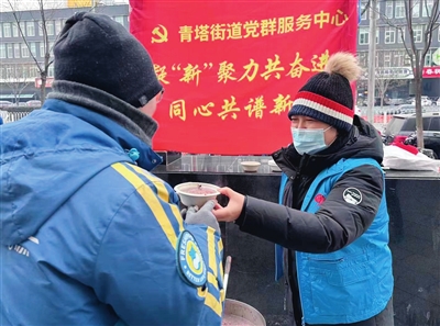 青塔街道党工委联合辖区嘉和一品粥(大成路店)、盒马鲜生(大成路店)等商家共同开展了“浓情腊八节,‘粥’到暖人心”慰问活动,为辖区200余名户外工作者送上暖心腊八粥和节日的祝福。