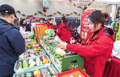 龙年春节将至,年货消费进入旺季。丹东大草莓、进口车厘子、山东大苹果……色彩鲜艳的农产品摊位热闹非凡,近日,第二届新发地年货节暨集采集配节在北京新发地农产品博览中心开幕。据了解,第二届年货节为满足市民“一站式”购买传统年货和特色农产品的需求,拓宽扶贫地区和乡村振兴农产品销售渠道,推进市场转型升级和实现丰台经济“倍增”,开设了民俗坊、公共品牌专区、特色农产品专区等多个展销区,增设了“年味食足,好运长龙”新春大集,百余种农副产品扎堆“赶集”,现场消费者络绎不绝。
