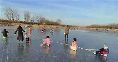 但很多时候,冰面并不是我们肉眼所见的样子。在一片规模较大的水面上,很可能出现部分区域结冰较薄甚至并未上冻的情况,而游玩者又往往难以预判。再加上冰面在冰刀、冰车以及人力的磨损下,已经受力不均,野冰又没有专门人员与机构进行维护,很难保证不发生意外。