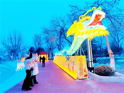 游客正在拍摄青龙祈福花灯。赵智和 摄 王佐镇青龙湖公园新春灯会从正月初一一直延续到正月十六,汉唐灯光、民俗表演、打铁花、各种特色美食……打造沉浸式观灯体验,为首都市民群众营造一个新的春节打卡地。