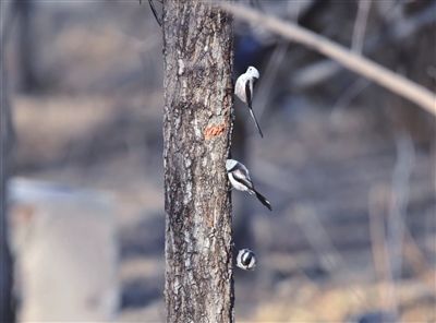 北长尾山雀(上、中)和银喉长尾山雀(下)在树上嬉戏。佟浩 摄