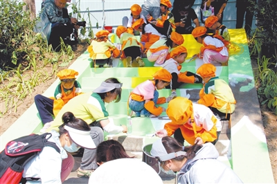 原本灰暗无光的石阶在孩子们的妙手下焕发出勃勃生机。