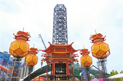 9月14日,首届“京彩灯会”——2024年北京中秋国庆彩灯游园会将在北京园博园“亮灯”。届时,百余组绚丽花灯将一起点亮,同时带来文娱演出、美食、亲子游乐等,打造“夜市、夜游、夜秀”多元业态。目前,灯会开幕已进入倒计时。园区内工人正在施工,各式彩灯也初见雏形,等待5天后的华丽绽放。图为北京园博园3号门的团圆宫灯正有序搭建中。 赵自谦 摄