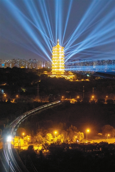 北京中秋国庆“京彩灯会”于9月14日在北京园博园正式亮灯,近日记者来到园博园周边探访。夜幕下,被点亮的永定塔熠熠生辉,一列火车疾驰而过,在灯光下别有一番意境。 姜灏 摄