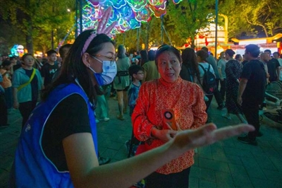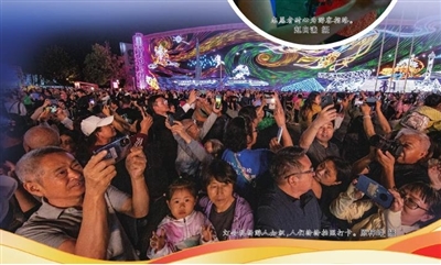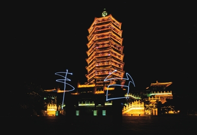 永定塔,作为第九届中国(北京)国际园林博览会的标志性建筑,以其辽金风格的八角九层外观,矗立在鹰山之上,成为丰台区的地标性建筑。在灯光的映衬下,永定塔的层层重檐更显庄重肃穆,金碧辉煌的塔身在夜空中熠熠生辉。随着“京彩灯会”的开幕,丰台区的旅游热度持续上升。在“京彩灯会”开园首日,有游客用手机灯光在空中留下“丰台”的印记,通过社交媒体分享他们的独特体验。林瑶 姜欢 文 原梓峰 摄