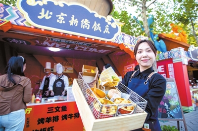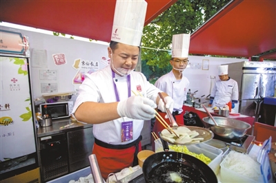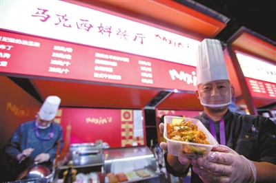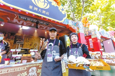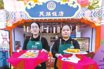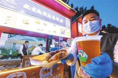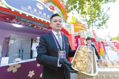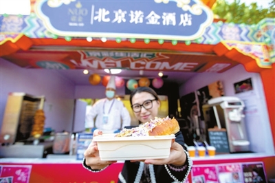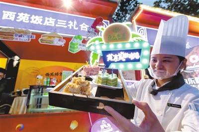 本报讯(记者 李娜 张馨予 实习记者 周南 薛嘉茵)北京诺金酒店的原味牛角包,北京亚洲大酒店的中街八号奶皮子酸奶,民族饭店的饽松松和朗姆提子白脱饼干,北京国际饭店的极佳级双层牛肉芝士汉堡和招牌火焰山牛排……这些平时经常需要跑断腿、排长队才能吃到的美食,在北京园博园2号门内的京彩生活汇区域,游客几乎可以随到随点,随时吃到大厨新做的、热乎的、最为正宗的星级酒店美食。