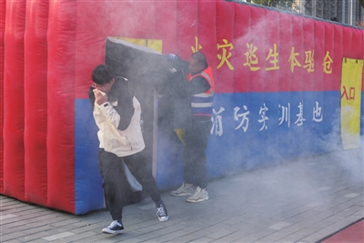 参演人员在体验仓模拟火灾逃生。