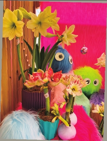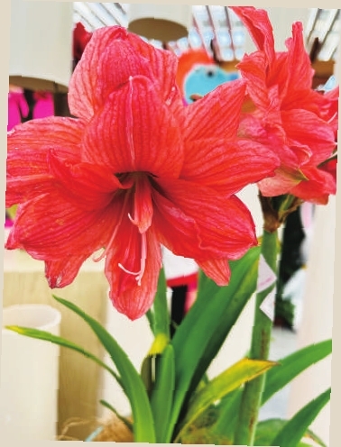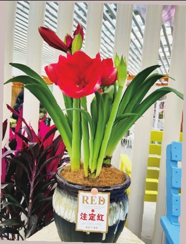 一进门,展厅里“注定红”三个大字映入眼帘,整个展厅被精心划分为六大主题区,新年主题区、圣诞主题区、机器娃娃风、白色家庭园艺、中式家庭园艺、动画主题区供游客打卡拍照。而“注定红”则是取了朱顶红的谐音,寓意来年红红火火。此次朱顶红展出了来自世界各地的经典品种,我国的自育品种“艳阳高照”,红白相间的复色重瓣,花头多,花开时热烈喜庆在阳光下绚丽夺目;来自荷兰的“甜蜜仙女”,硕大的粉色花头簇拥开放,仙气十足,花瓣略带卷边,像位含羞的少女亭亭玉立;“花孔雀”有淡淡的花香,被花友赞誉“神仙颜值”,这也是很多人喜爱的重瓣朱顶红品种,花朵层层叠叠呈莲花状,花瓣尖部羽毛状的条纹,犹如翩翩起舞的孔雀,是朱顶红家族中的佼佼者;直径40—50cm的开花机器“阿拉斯加”,纯白色重瓣一球可以多花剑,一杆多花头,远远看去绚烂无比;白色“毕加索”花美、花多、花期长、叶子挺拔,红色的花瓣边缘像是擦了胭脂的时尚女郎,让你一眼惊艳。“朱顶红属于石蒜科属,是南方的花卉,原产南美洲巴西和秘鲁,偏好温暖潮湿的环境,自然花期为5—6月,3—4月长出花苞。其外观类似洋葱,花瓣颜色和纹路变化多样,目前展出的国产品种4—5种。” 世界花卉大观园科普部主管介绍道。