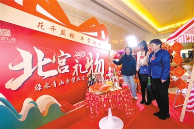 记者在“北宫礼物”的展台看到,金属透明漆书签在灯光下熠熠生辉,印有丰台地标的酸奶摆放得整整齐齐,色彩丰富的造型花馍栩栩如生。