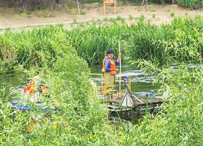 石榴庄段(水上森林)是凉水河丰台段最后一部分,以其自然风光和丰富的生态资源而闻名,我们就称之为自然之光吧,未来将打造成“生态休闲区段”。记者进入石榴庄段之后,听得蛙鸣声声、鸟儿欢唱,时不时还看到野鸭在水面游弋。记者看到河水清澈、水面宽阔,河上有工人正在驾着小船清理河道,水里有茂密的鸢尾草及梭鱼草和丰富的野生水植物,岸边还传来悠扬的笛声。