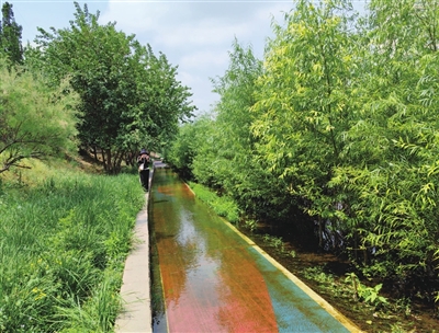 西罗园-大红门段是凉水河丰台段的重要组成部分,紧邻南中轴,岸上就是南中轴国际文化科技园,未来将打造成“文化博览区段”。大红门段如同生机勃勃、活力四射的南中轴,所以暂且把这一段称之为“蓬勃之源”。记者现场看到,大红门段的河道宽阔、水流平稳,两岸有绿化带和休闲空间。河面上是郁郁葱葱的鸢尾草和芦苇,有一人多高,茂密处看不到对岸的景色。一只戴胜鸟在河北岸的草丛里觅食,蹦蹦跳跳地时而钻入草丛,时而冲到河边。记者发现,这段的游人明显增多,男女老少都有,三个一群两个一伙,或遛弯散步或打卡拍照或悠闲地放着风筝,行人成为凉水河的风景,五颜六色的风筝镶嵌在瓦蓝的天空,犹如留白超大的巨幅画卷。