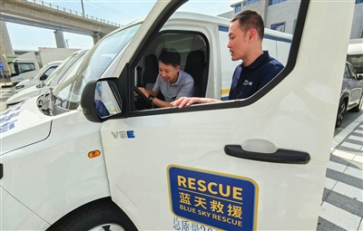 吉利远程4S店工作人员正在介绍与蓝天救援队合作的抢险救援车。赵智和 摄