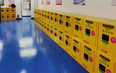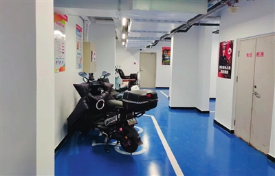 顺着坡道走进地下车库,门厅区洁白的墙面、蔚蓝的塑胶地面和墙边明黄的两排防爆柜色彩绚丽。电动自行车到此都要卸下电池,放进防爆柜内,然后才能推着进入里面的停车区。