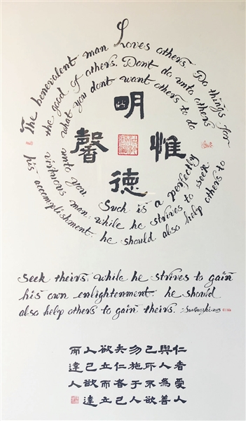 路虽远,行则将至;事虽难,做则必成。他回国后立即行动,购买书法书籍、英文书籍、中英文书籍和宣纸、毛笔等,利用业余时间开启研究中英文书法之旅,他要书写出让外国人也看得懂、也喜欢的书法作品。他没有拜师学艺,而是通过自学,一笔一划地探索汉字的魅力,探索毛笔书写英文的魅力。